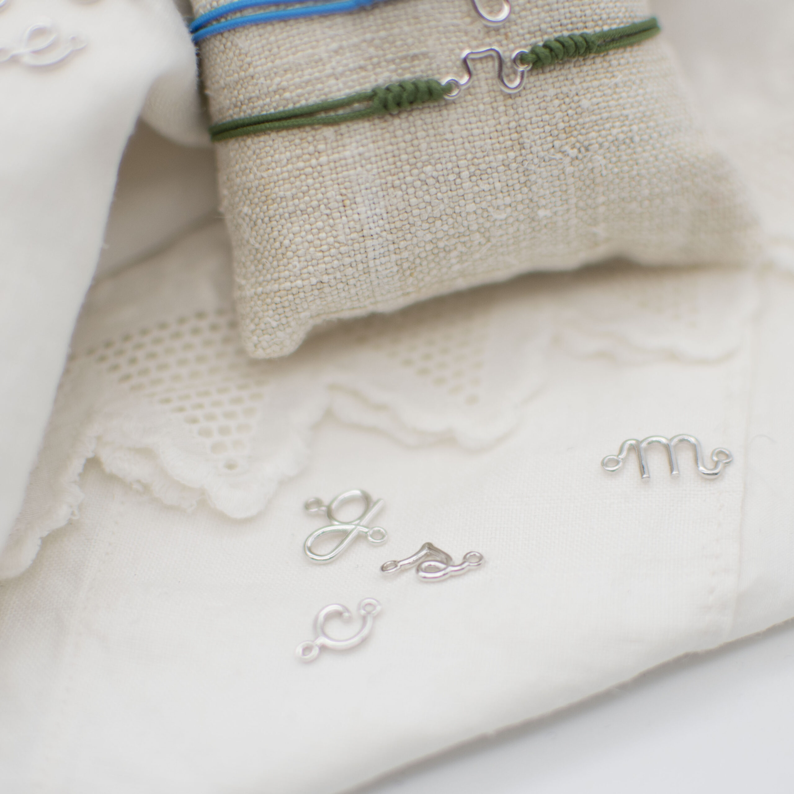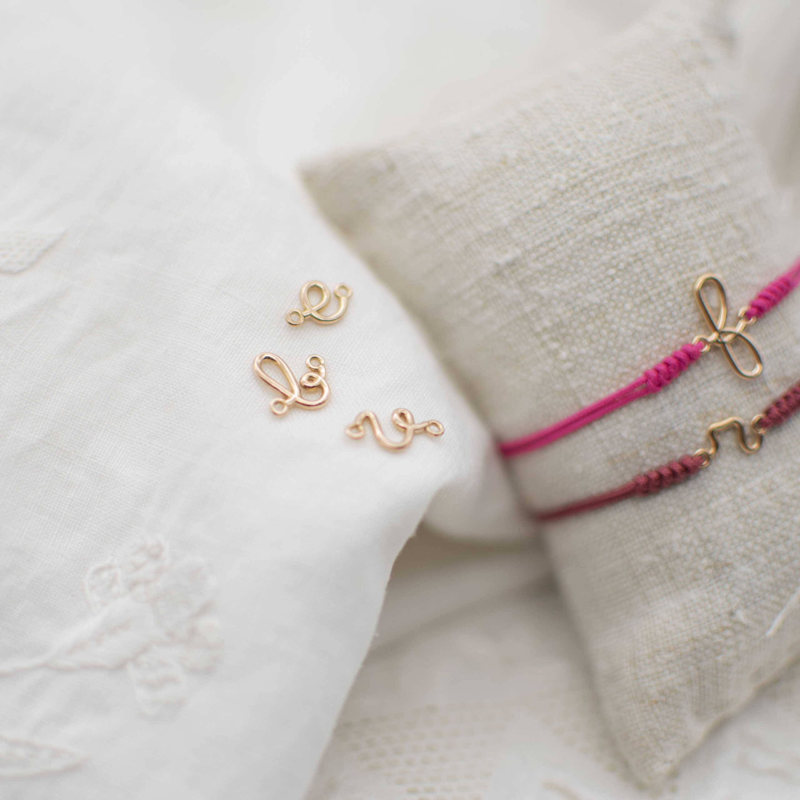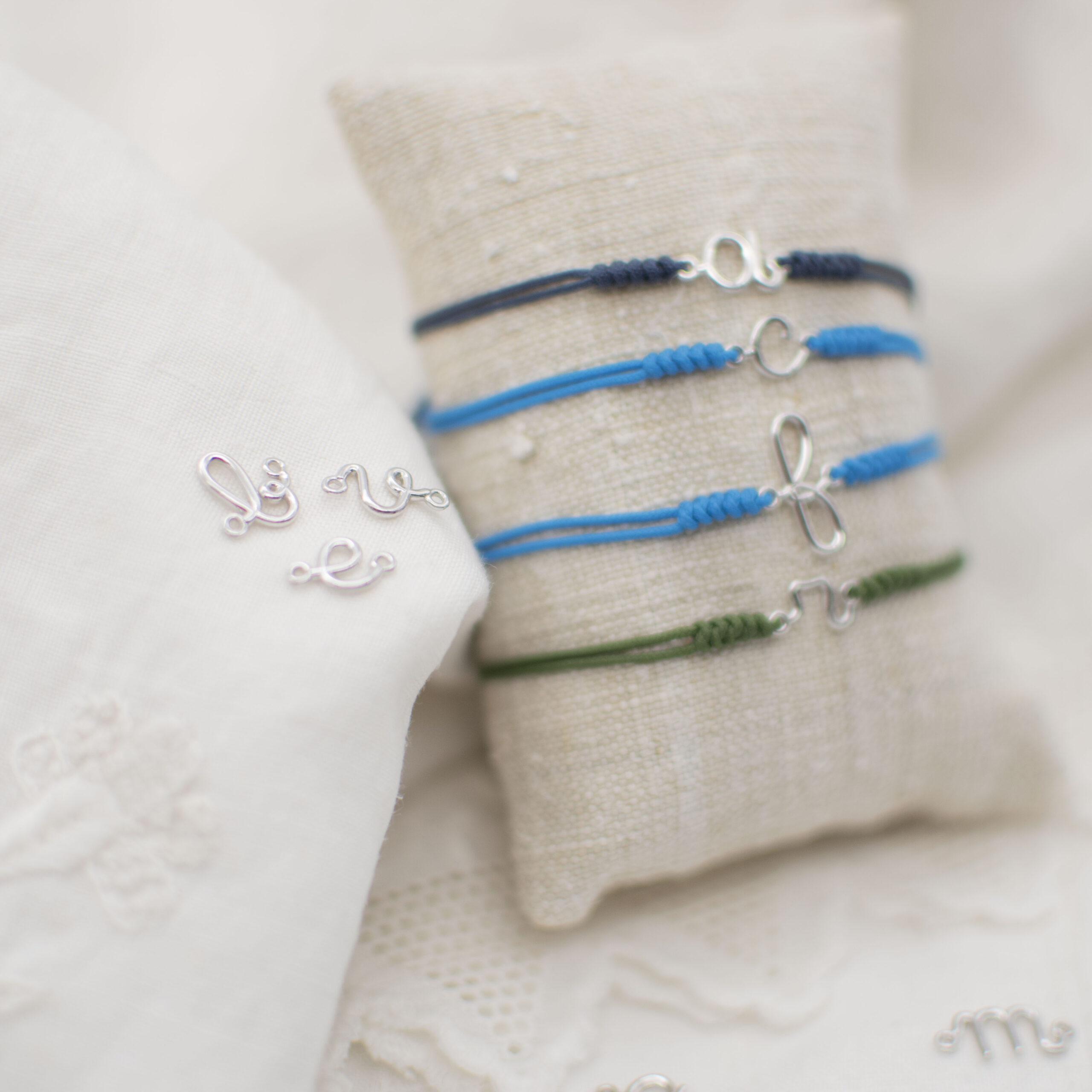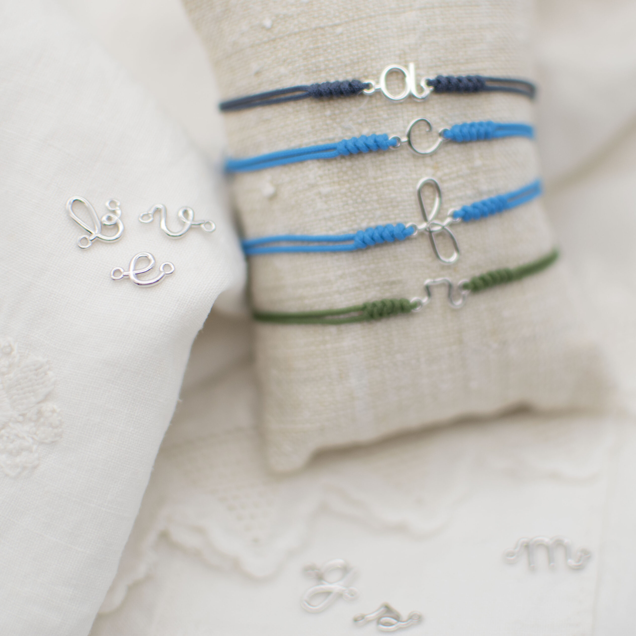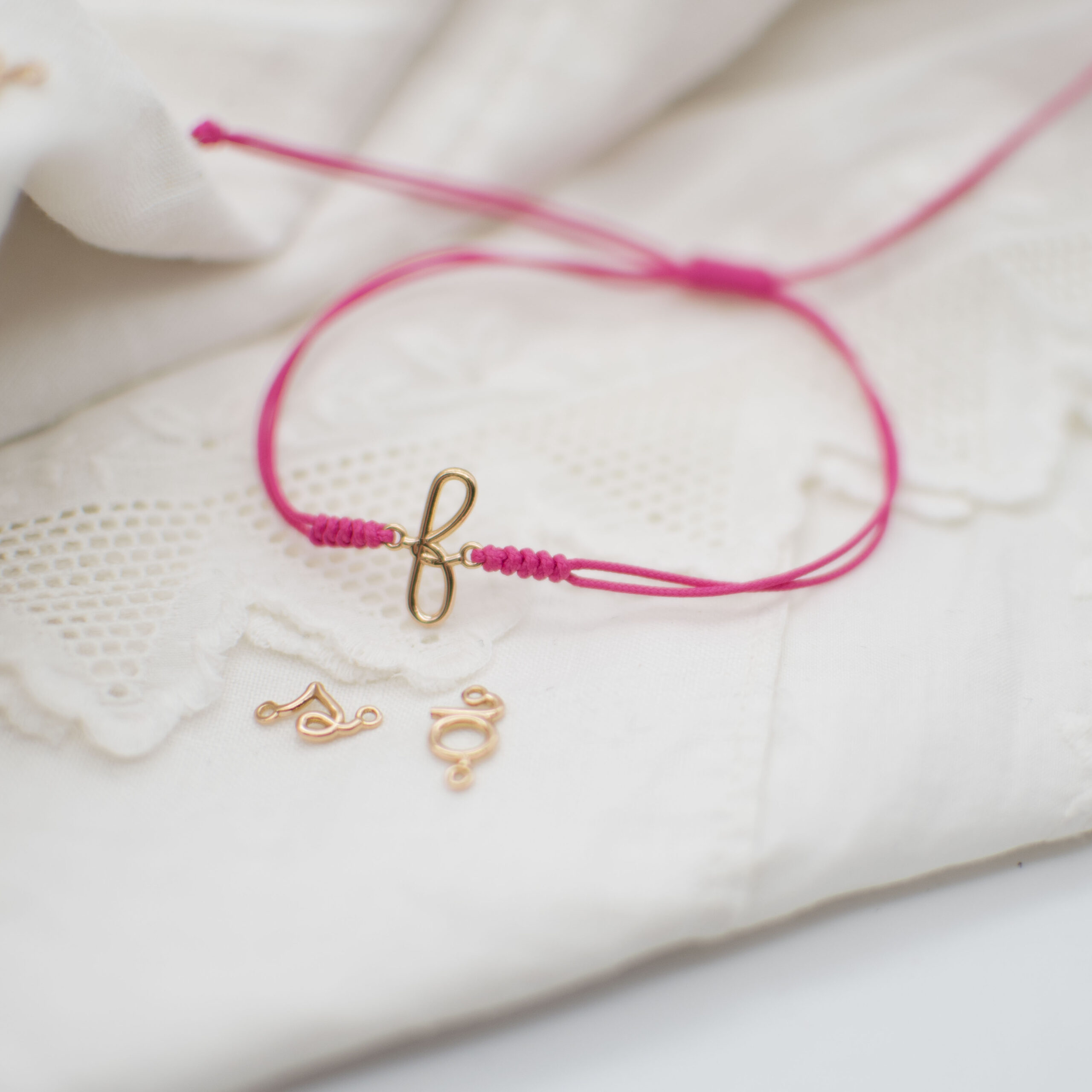 Un bracciale unico, realizzato interamente a mano con una lettera in oro 18 Kt (disponibile in oro bianco o rosa) disegnata esclusivamente da noi, abbinata a una resistente sagola nautica.